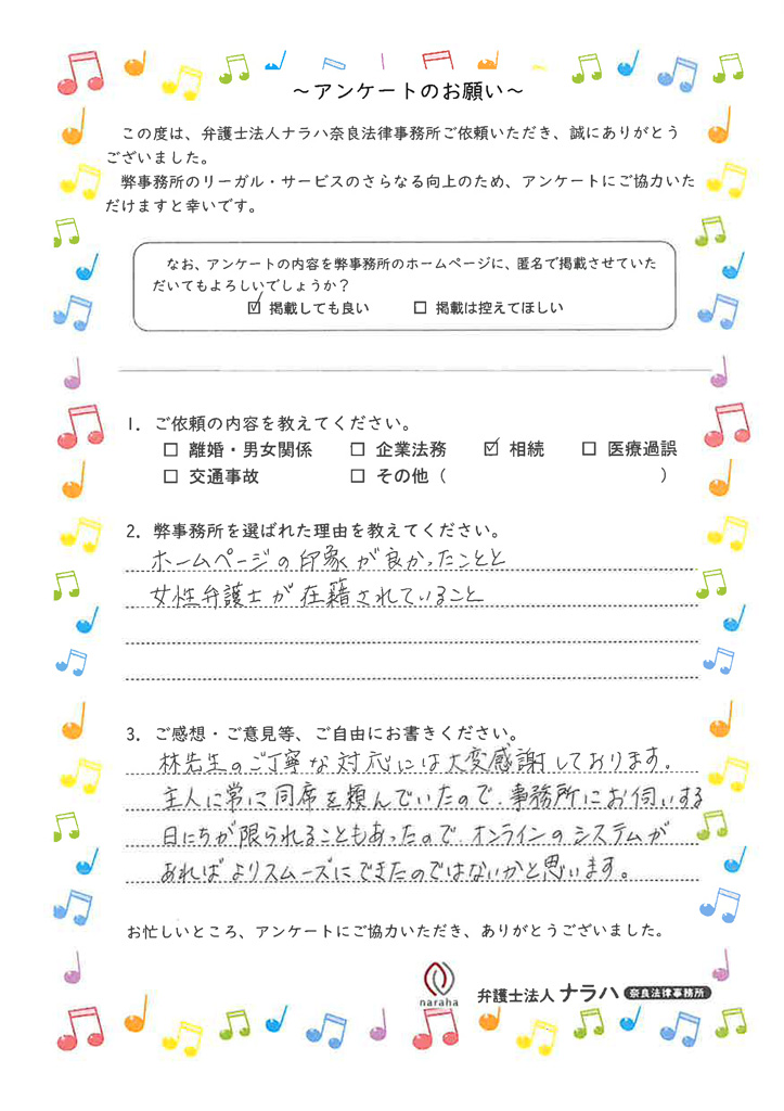 主人に常に同席を頼んでいたので、事務所にお伺いする日にちが限られることもあったので、オンラインのシステムがあればよりスムーズにできたのではないかと思います。